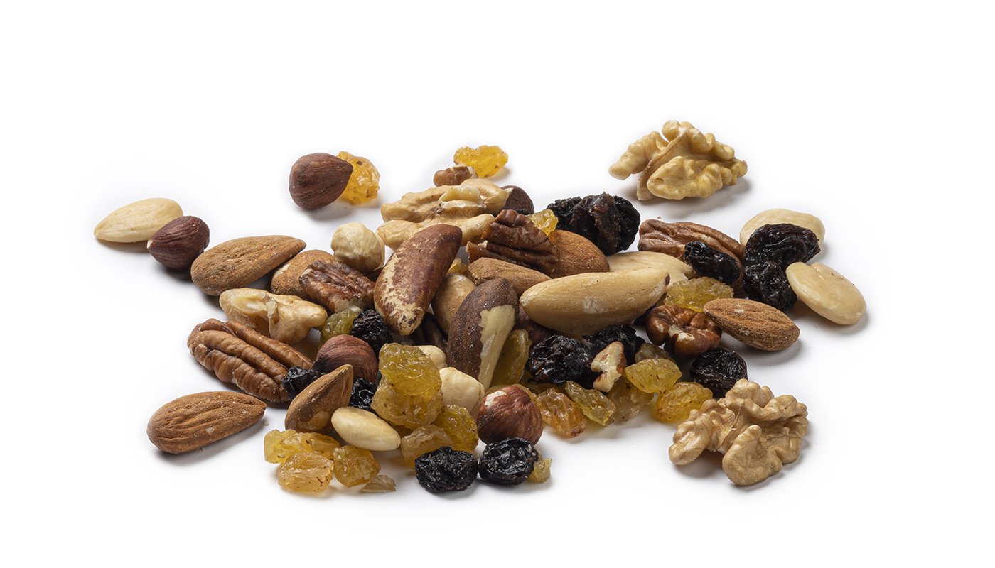 Mix van ongebrande noten en rozijnen: Walnoten, Pecannoten, Blanke hazelnoten, Bruine hazelnoten, Blanke amandelen, Bruine amandelen, Paranoten, Gele rozijnen, Blauwe rozijnen.